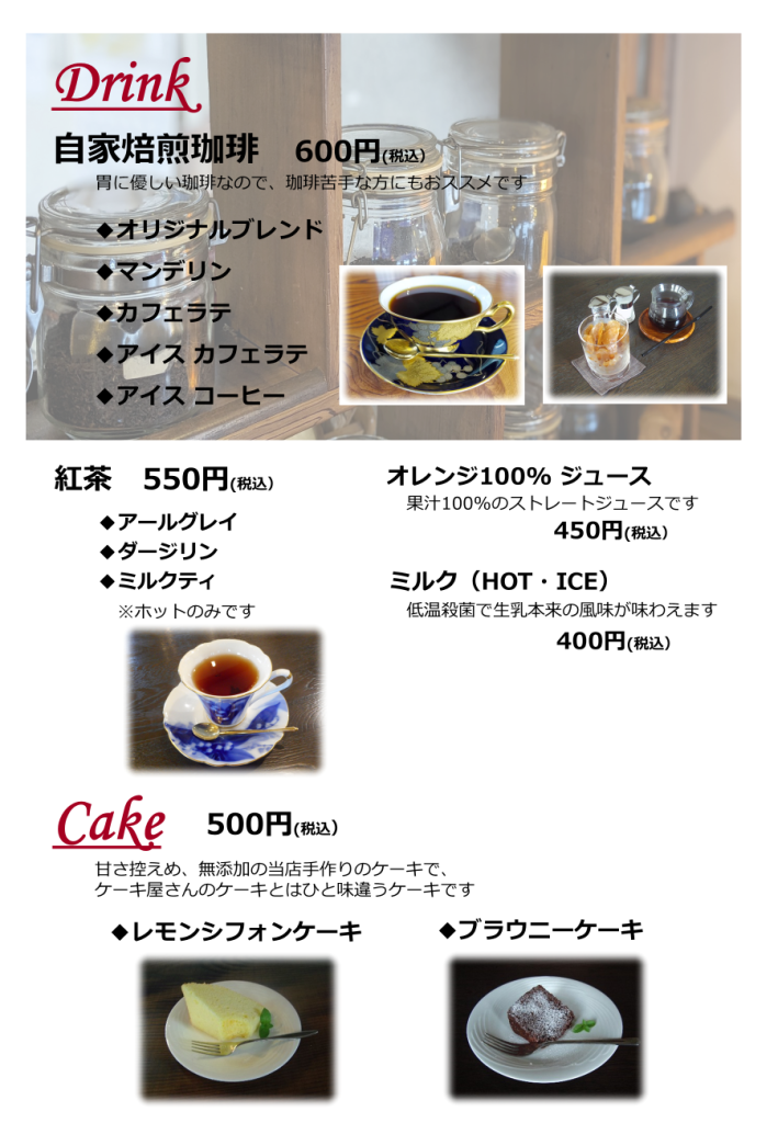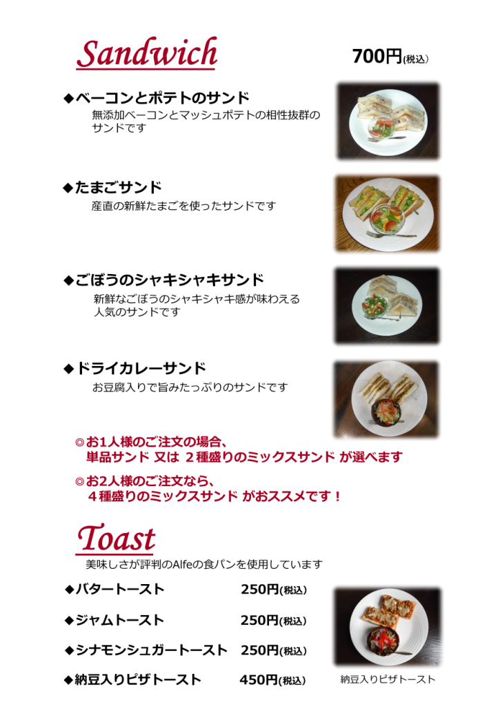 珈琲豆や食パン、その他食材の値上げの影響を受け、やむを得ず、珈琲、紅茶、ジュースなどのお飲み物、サンドイッチやケーキについて価格改定をさせていただきます