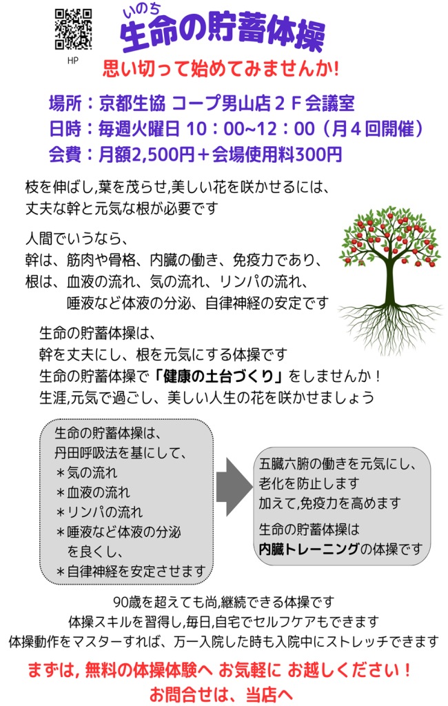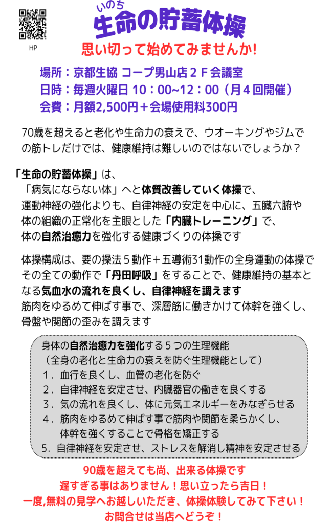 ◆生命の貯蓄体操は、東洋医学を基にして呼吸法を中心に気血の流れを整えていく体操です